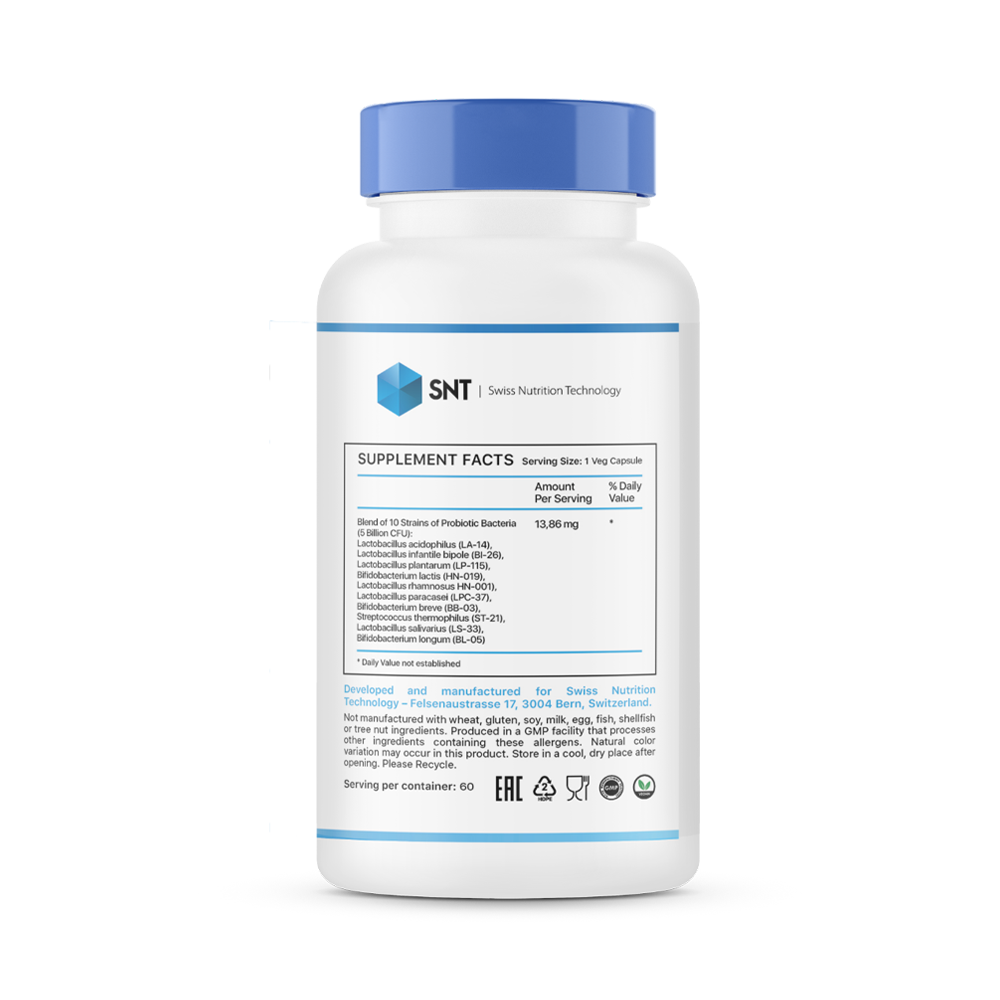 Пробиотическая смесь от SNT содержит 10 активных и клинически изученных штаммов пробиотиков. Исследования подтверждают, что пробиотические штаммы в составе пробиотика SNT чрезвычайно устойчивы к низким уровням pH и воздействию факторов желудочно-кишечного тракта (например, кислоты, желчи, пепсина и панкреатина), а также закрепляются на клеточных линиях кишечника.